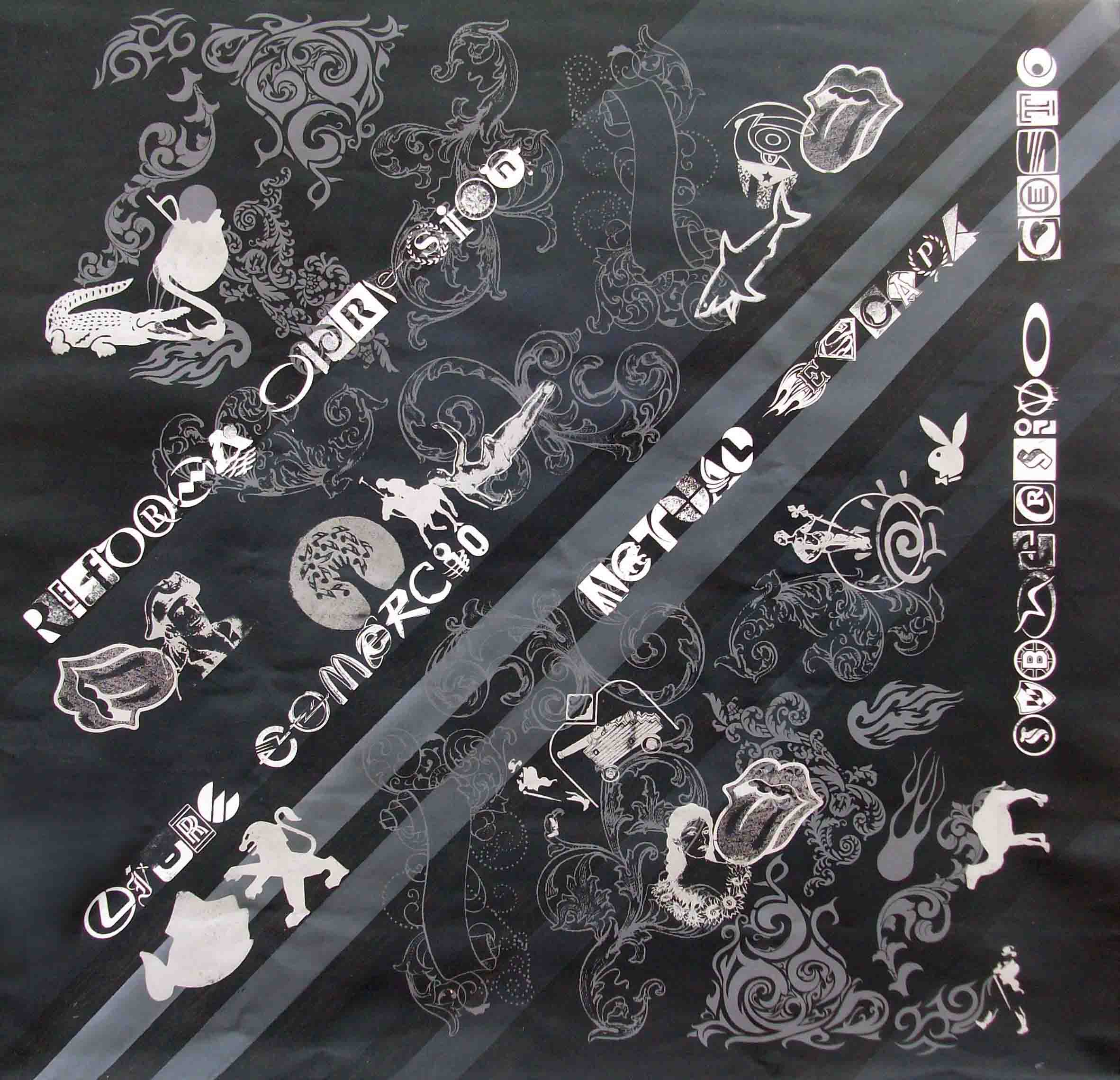Mi interés principal es analizar el contenido de los símbolos creados por y para la publicidad y la propaganda, así como la forma en que estos captan, reproducen o incluso generan el espíritu de su época. En mis composiciones manipulo logos figurativos y tipográficos, tanto nacionales como internacionales, que definen el imaginario colectivo actual. Transformo estos ideogramas en protagonistas de escenas y palabras que confrontan su propia naturaleza. Las historias que surgen evocan características promiscuas, bélicas y eclécticas de la sociedad actual.
