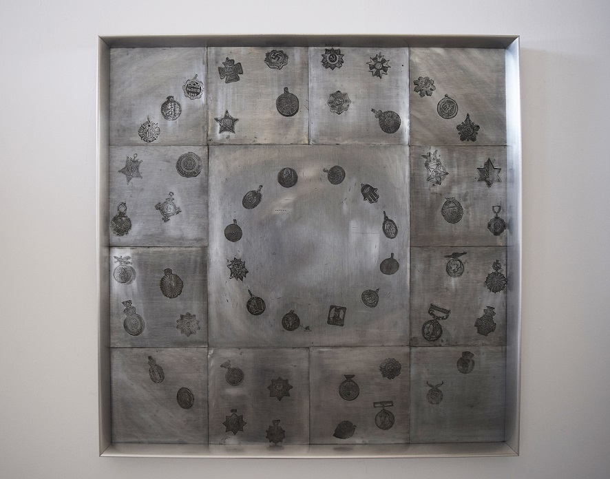 In an orbit, the nodes are points found where the orbit crosses a reference plane. In general terms, they constitute a real or abstract space in which the connections of other spaces that share characteristics and which in turn are nodes converge. They all interrelate in a non-hierarchical way and make up what in sociological or mathematical terms is called a network. This piece articulates a network of medals. The inner box contains 12 religious medals from different cultures and regions. The inner circle contains 12 religious medals. And the exterior medals of military decoration.. Explore hierarchies of value and distinction, established by man.