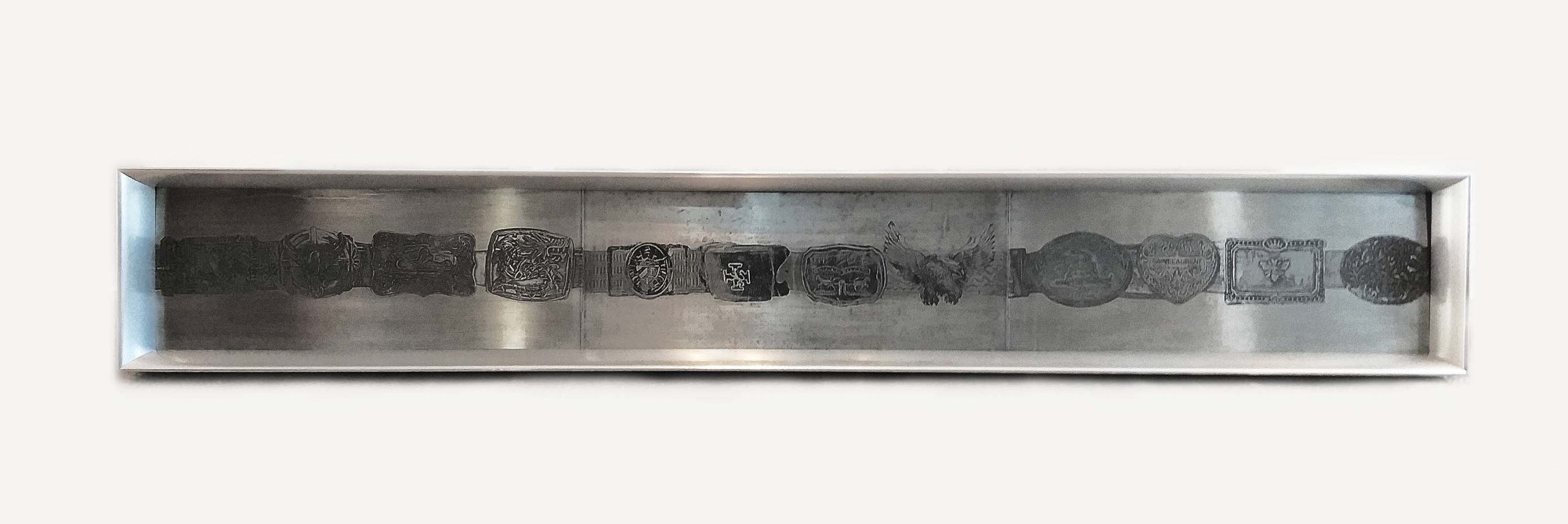 Constituye una secuencia de hebillas de cinto. La expresión “apretarse el cinturón” implica prepararse para tiempos difíciles. “Meter en cintura” por su parte comprende una suerte de contención y poder opresivo atribuido a la prenda. Este objeto hace crónica de su tiempo, sus diseños pueden ser especialmente distintivos del individuo que los porta. La secuencia narra una historia. El enlace de todas las hebillas mediante la correa, refuerza la unidad social y común estado de afección.