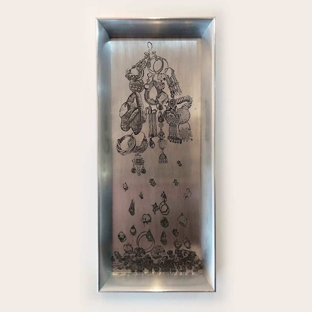 Se denomina revolución a un cambio profundo, generalmente violento, en las estructuras políticas y socioeconómicas de una comunidad. En matemáticas, superficie de revolución define a toda figura geométrica que se forma al hacer girar una recta móvil alrededor de otra fija. Las revoluciones (con)decoran y significan su imagen por medio de insignias, medallas, cinturones, alianzas, tocados. Los accesorios, lejos de ser un añadido superficial del vestuario, construyen o simulan la identidad y status del individuo. Empleo el metal por ser uno de los soportes más antiguos en la construcción de estos accesorios y el grabado, se aproxima a la técnica y superficie de los objetos citados.