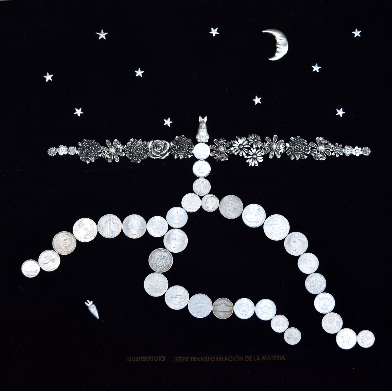 Bisutería, monedas, metal y marco de madera | Imitation jewerly, coins, metal, wooden frame.